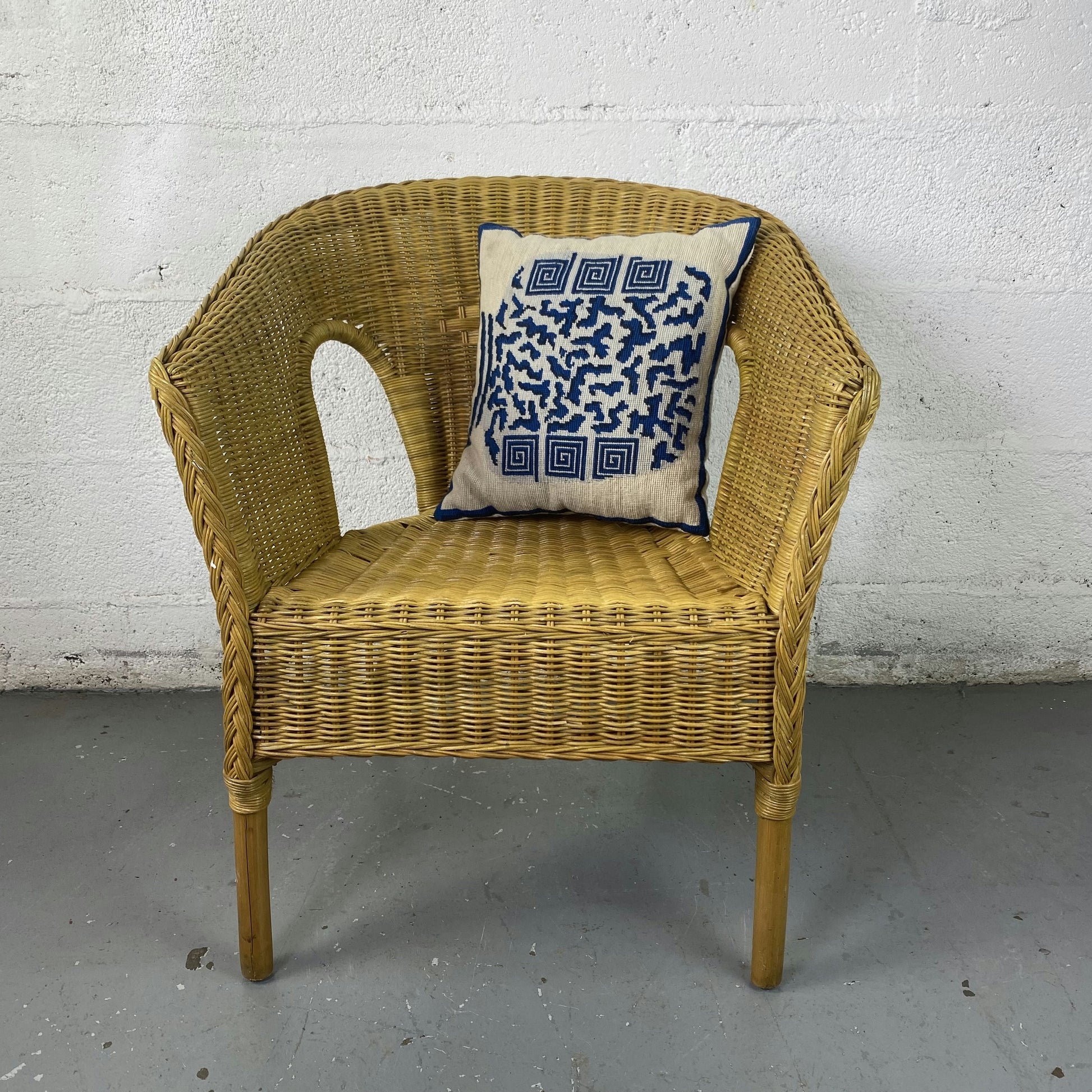 Ce fauteuil est en bon état général avec des finitions en rotin tressé qui ajoutent à son charme authentique, bien que des traces d'usure soient visibles. Son design unique et son confort en font un ajout précieux pour ceux cherchant un fauteuil en rotin tressé vintage pour leur décoration intérieure.