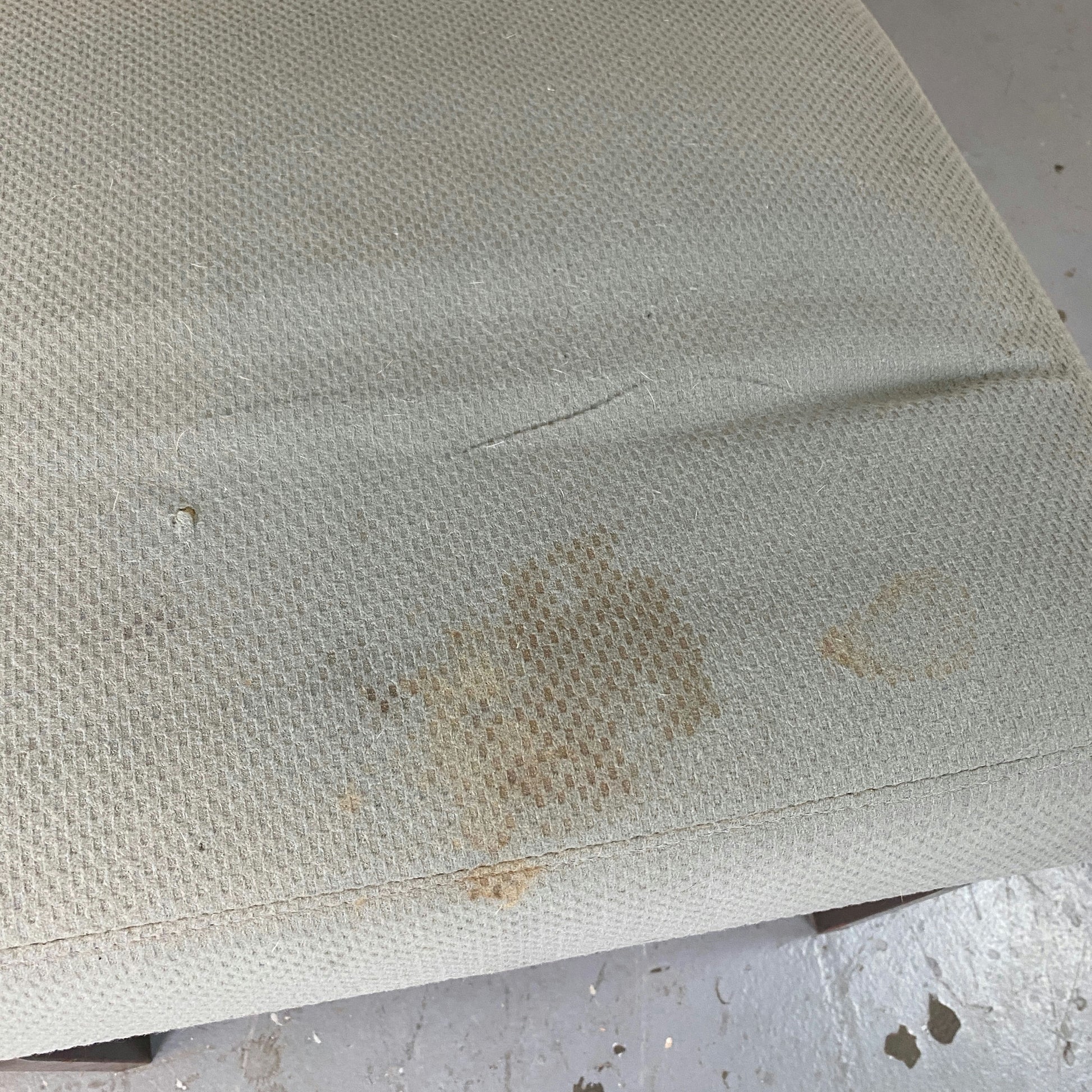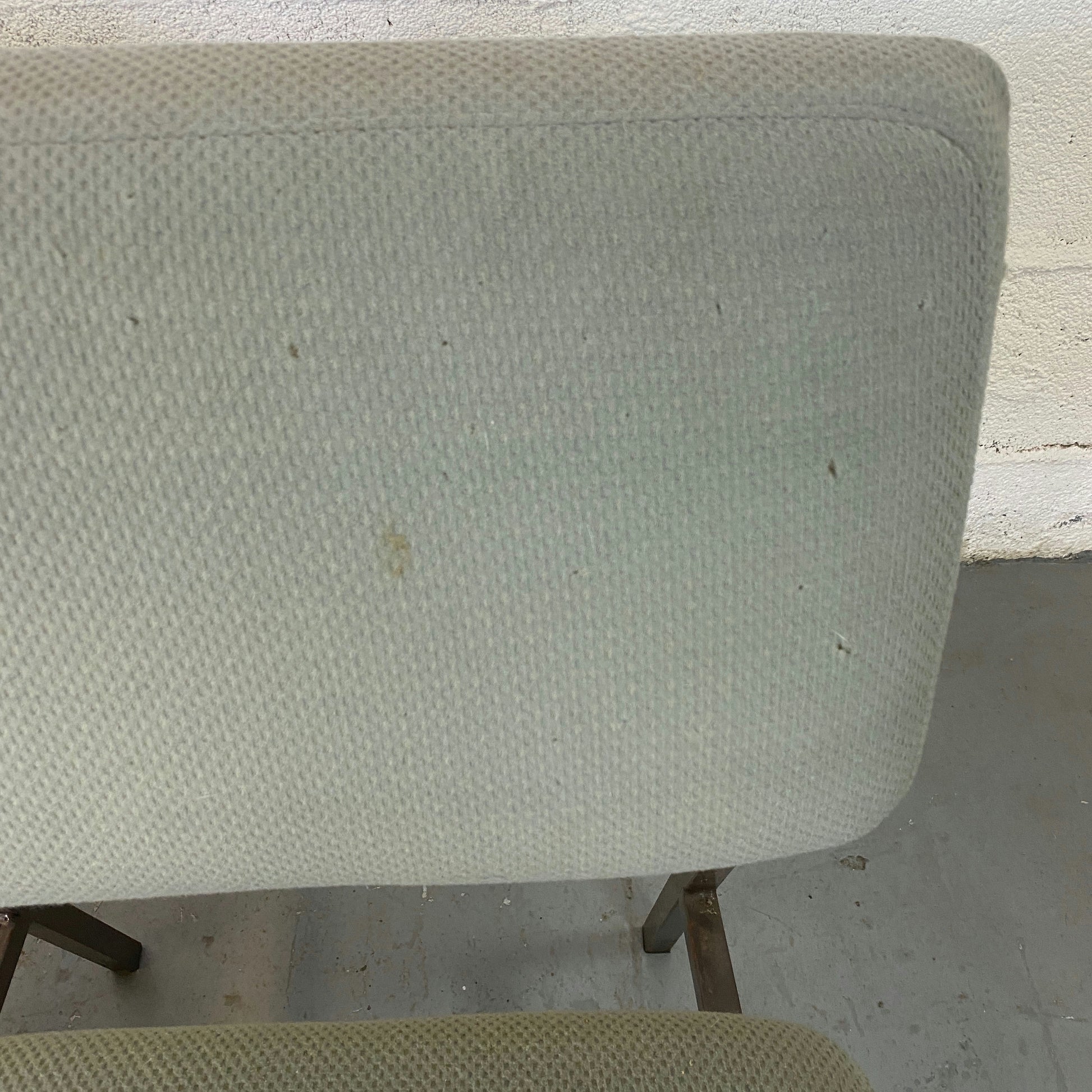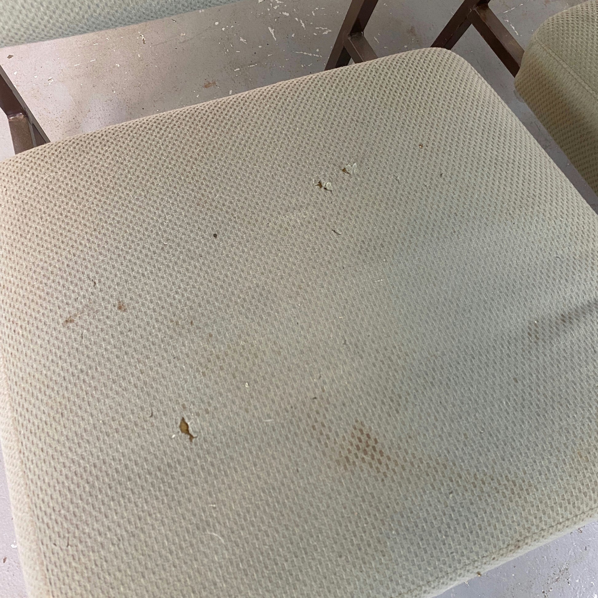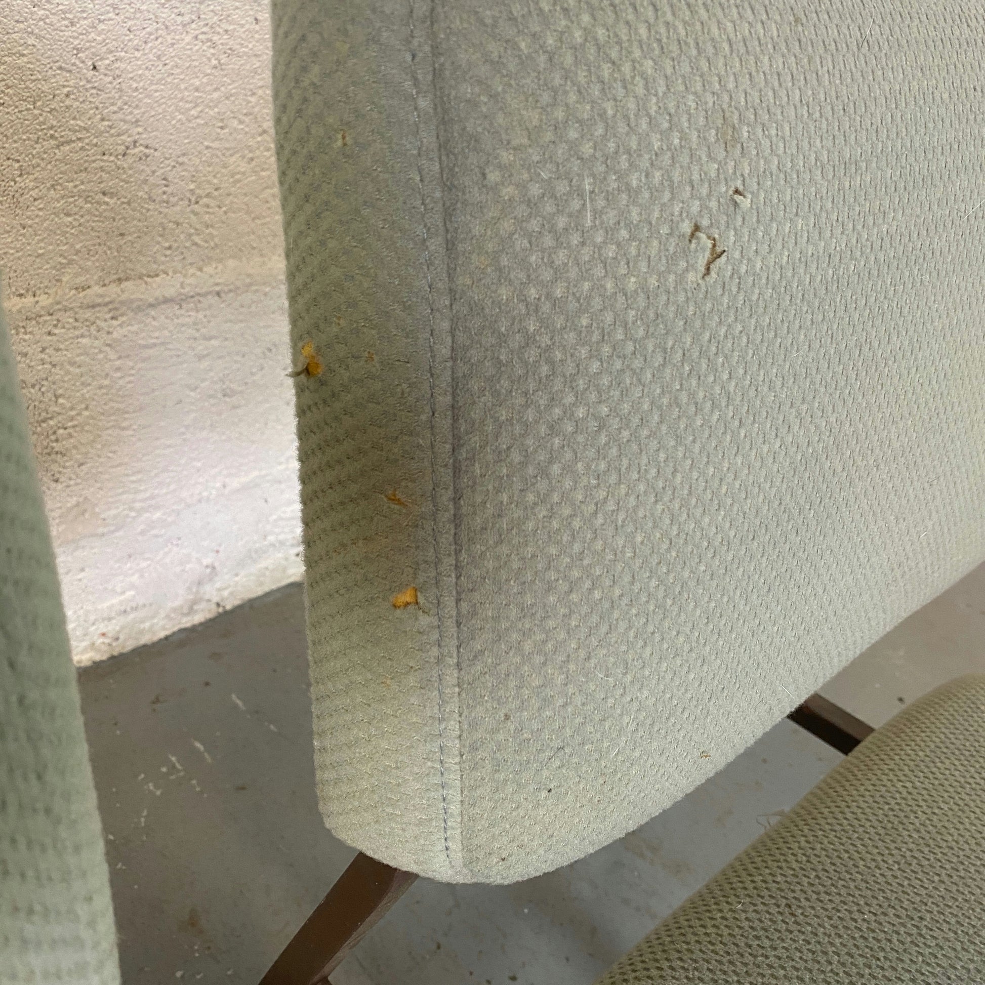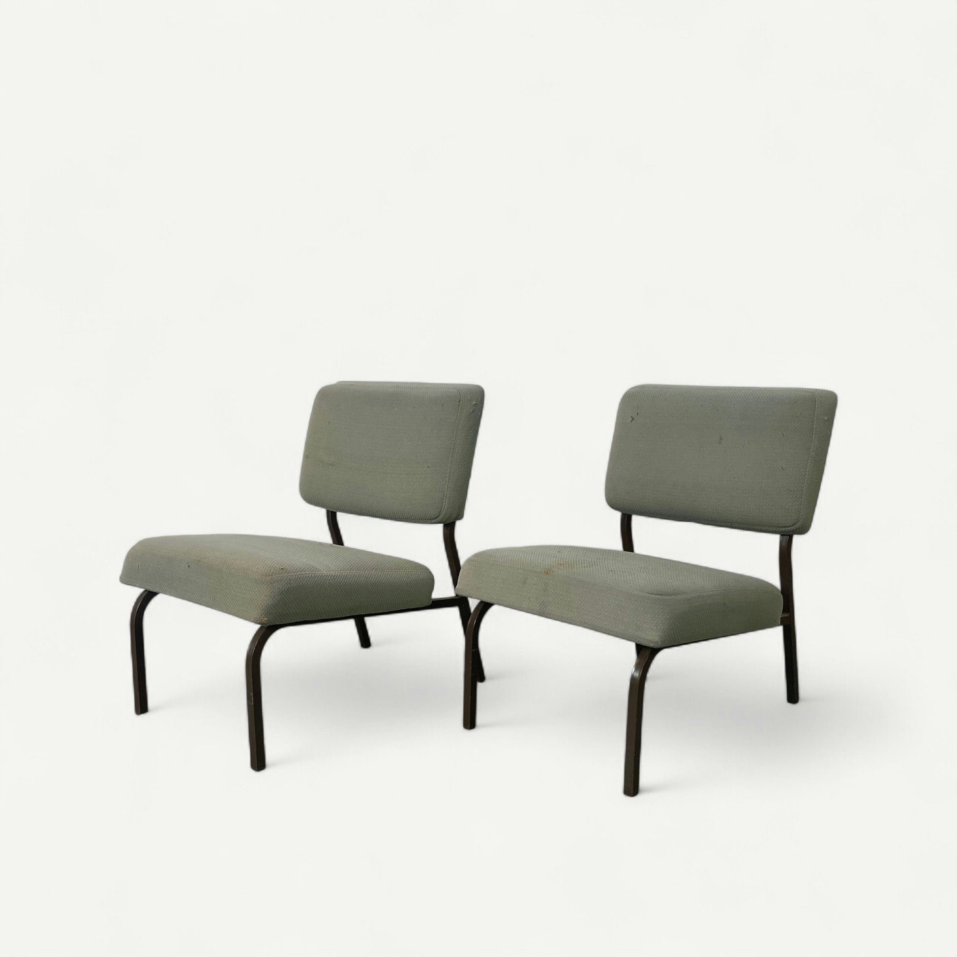 Paire de fauteuils avec assise verte en mousse avec une structure en bois (structure en bon état mais assise en mousse en mauvais état, probablement à changer), pieds en acier.